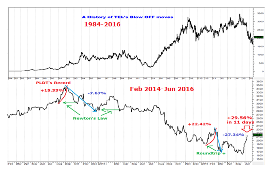 TEL was, in part, responsible for the shoring up of the index. That’s because another hysteric bidding episode sent TEL prices to the sky! The firm’s share price closed up by an astounding 4.9%! Since its milestone low at 1,624 in May 24, 2016, the largest Philippine Telco company have accrued a mindblowing 29.55% in just 11 trading days!